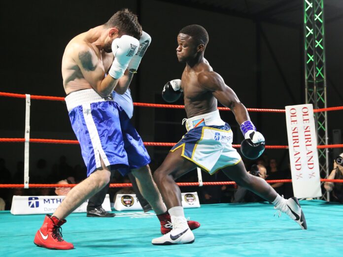 Det blev en nem dag på kontoret for Enock Mbilizi (4-0) da han ved Danish Boxing Promotions stævne i Vejle, stoppede sin overmatchede modstander Giorgi Gviniashvili (13-27-1) i anden omgang.